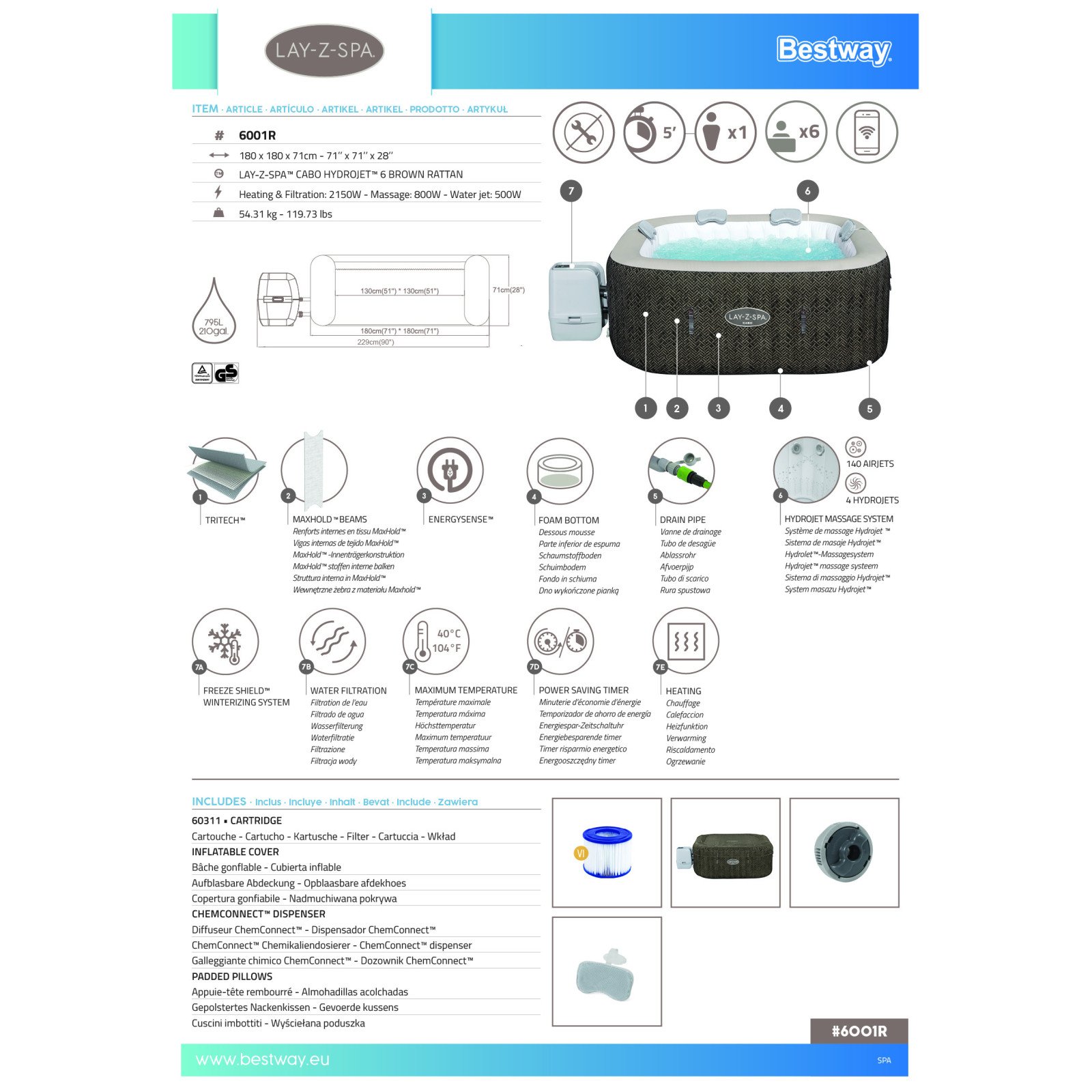 - Lay-Z-Spa 1.80m x 1.80m x 71cm Cabo MaxHold EnergySense Smart HydroJet 6 Brown Rattan Square 6001R